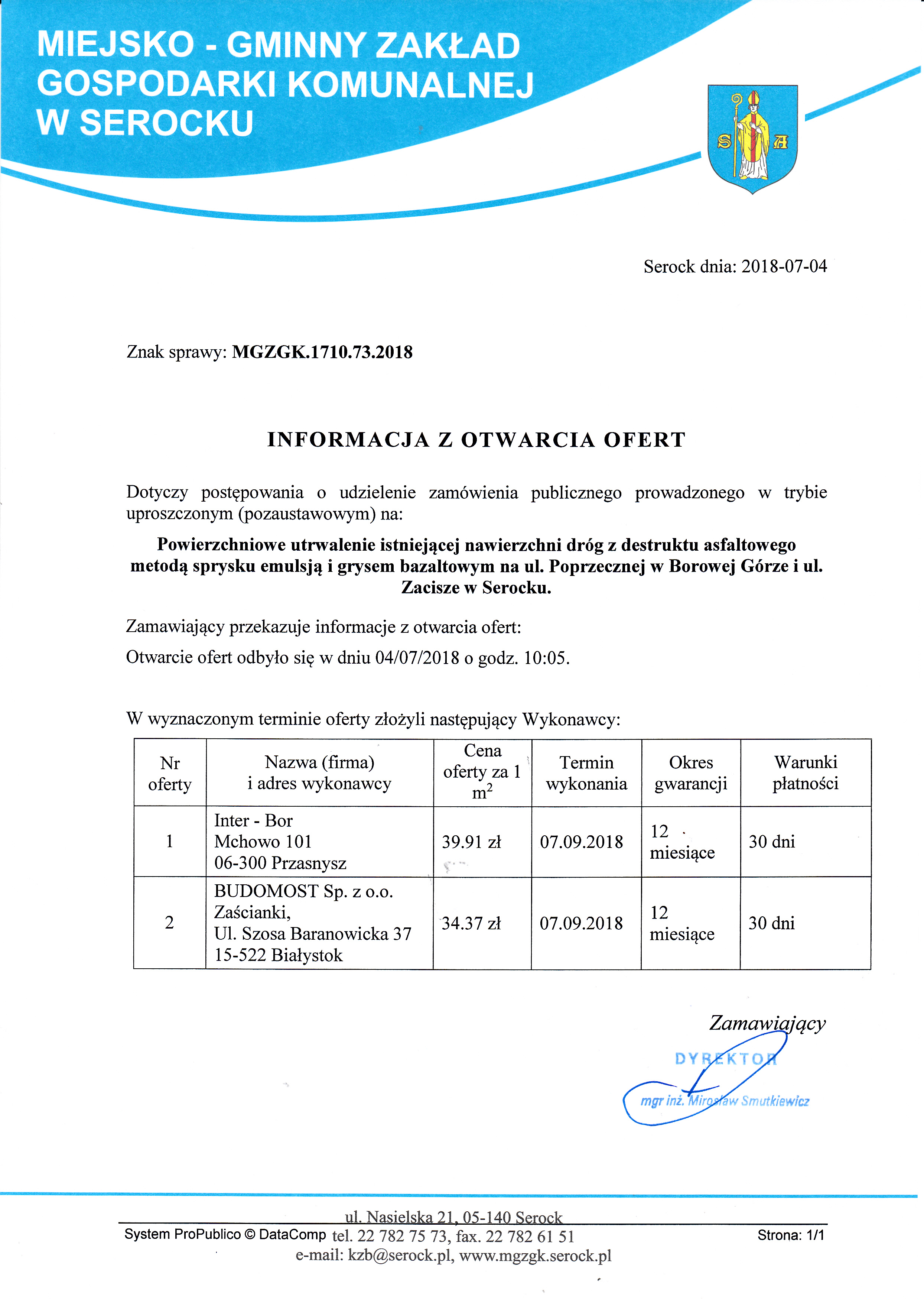 Informacja z sesji otwarcia ofert na zadanie pn. Powierzchniowe utrwalenie istniejącej nawierzchni dróg metodą sprysku emulsją i grysem bazaltowym na ul. Poprzecznej w Borowej Górze i ul. Zacisze w Serocku.